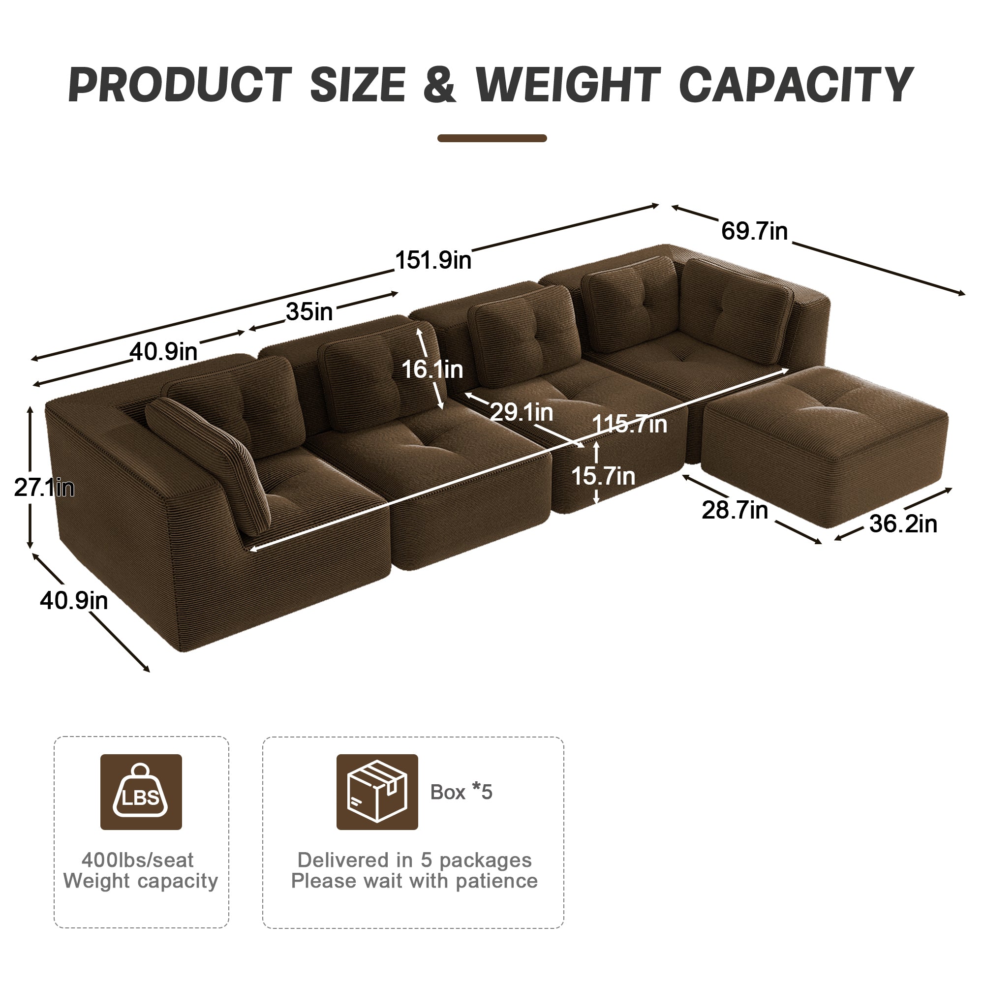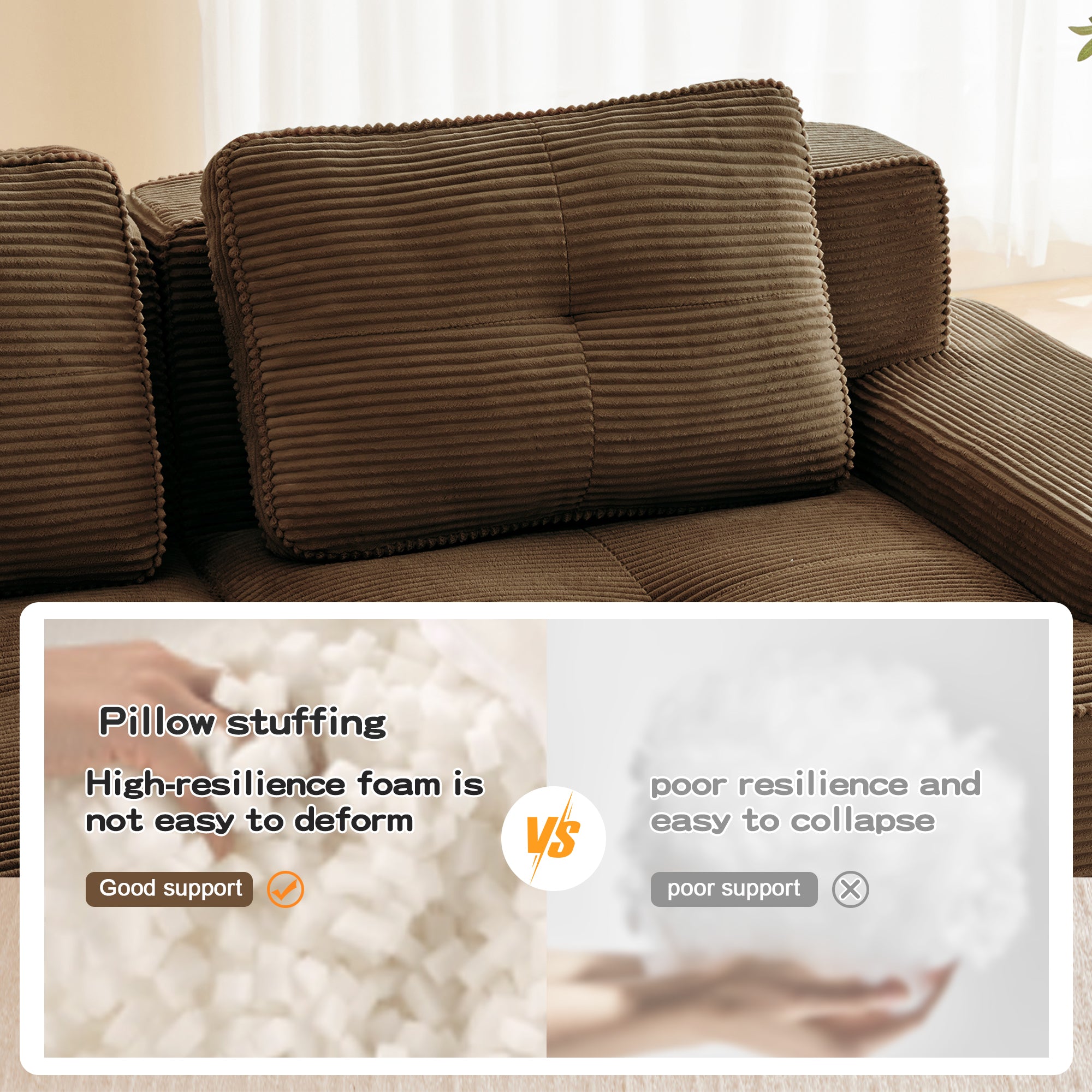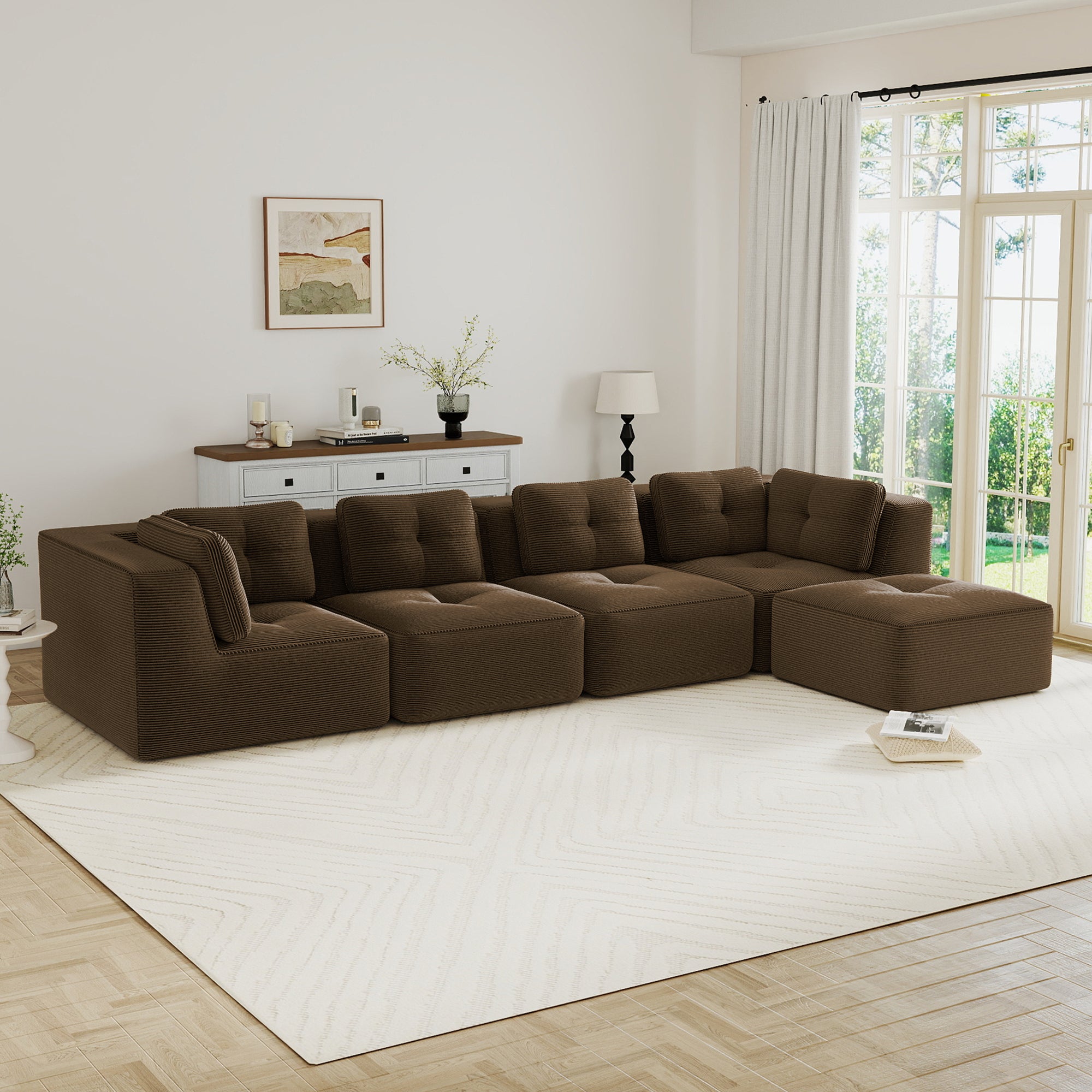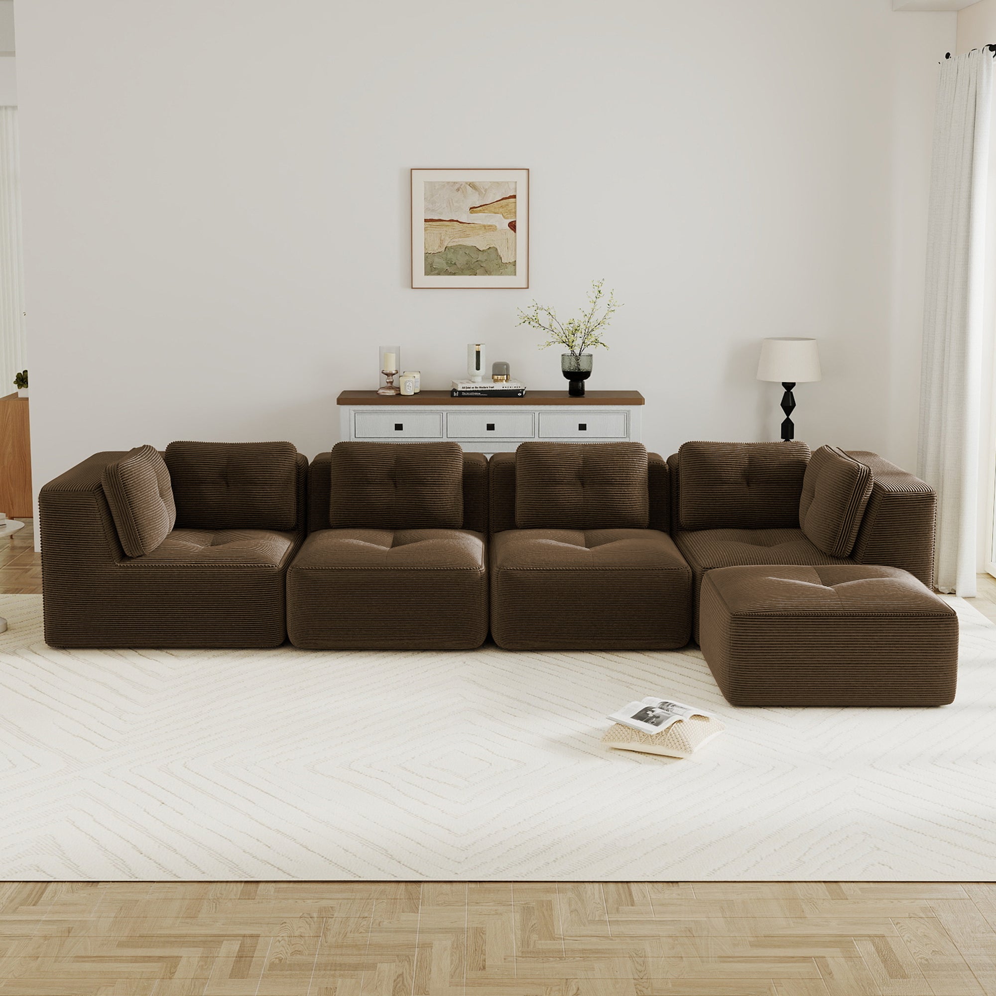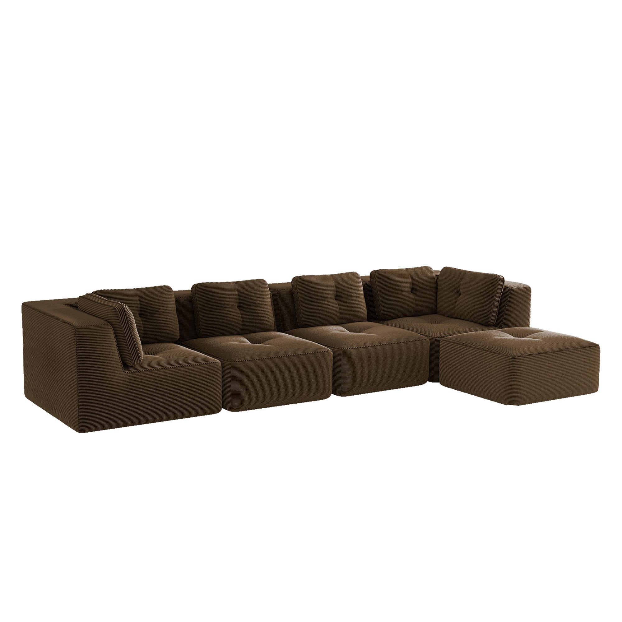 Modern Modular Sectional Sofa for Living Room, Corduroy Fabric, 4-Seater Couch with Deep Seat and Movable Ottoman,Pearl-like piping, Tufted Design,No Assembly, Anti-slip Design,Brown-W714S01811