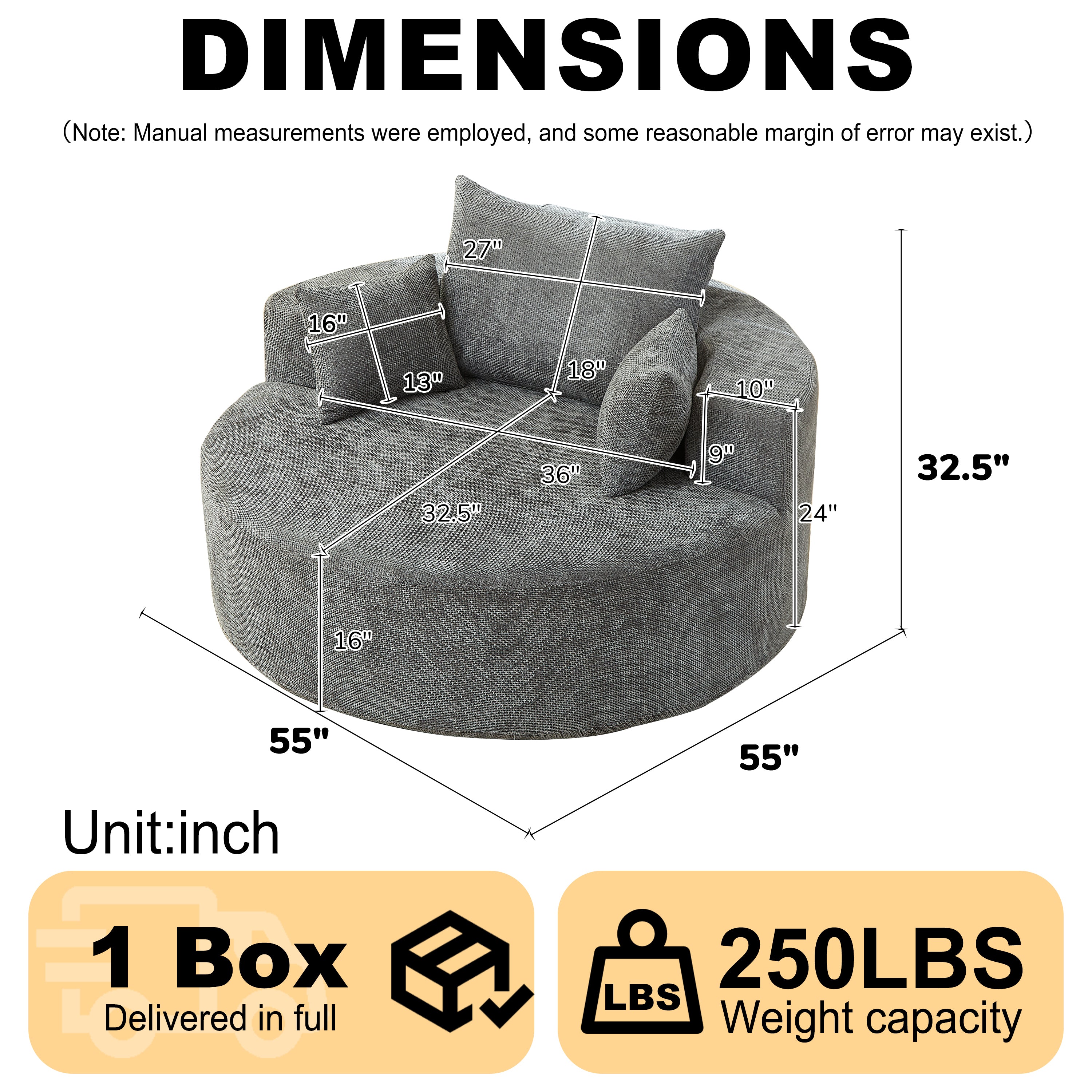 Specifications Place of Origin China Main Color Grey Main Material Chenille Filler Foam Seats 1 Seat Dangerous Goods #dangerFlag# Dimensions & Weights Assembled Length (in.) Not Applicable Assembled Width (in.)...